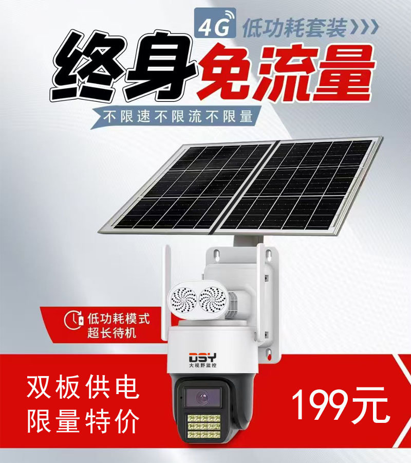 【终身免流量】大视野962DH-4G太阳能监控套装(双板供电 续航7天左右) 人形跟踪 语音对讲