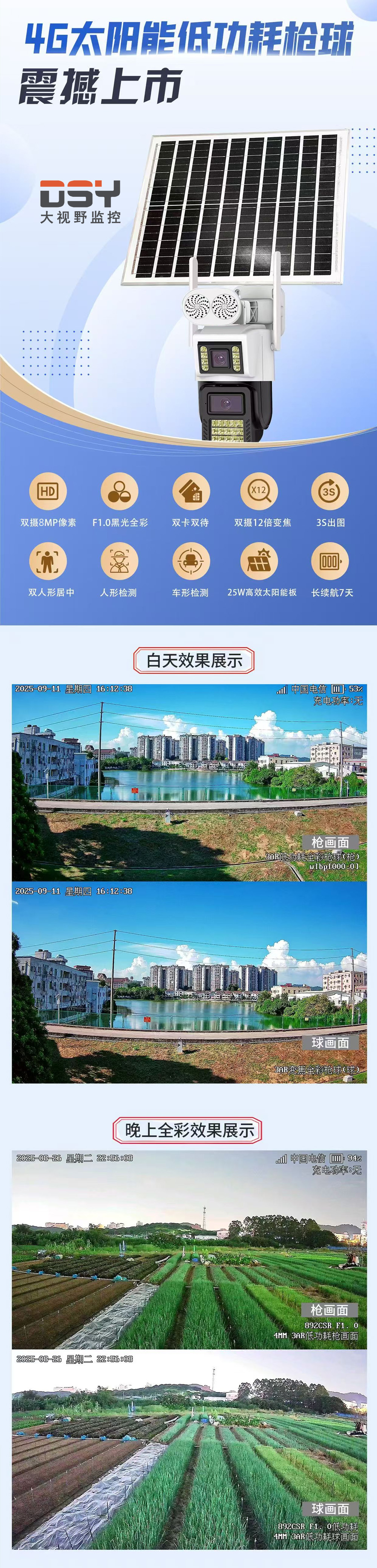 商品名称:【终身免流量】大视野892DSR-4G臻全彩 双目800万 太阳能监控套装